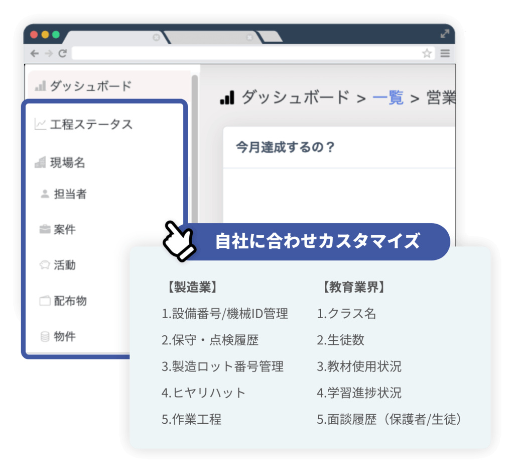 貴社の営業プロセスに合わせて、入力項目・管理方法・レポートを設計します。